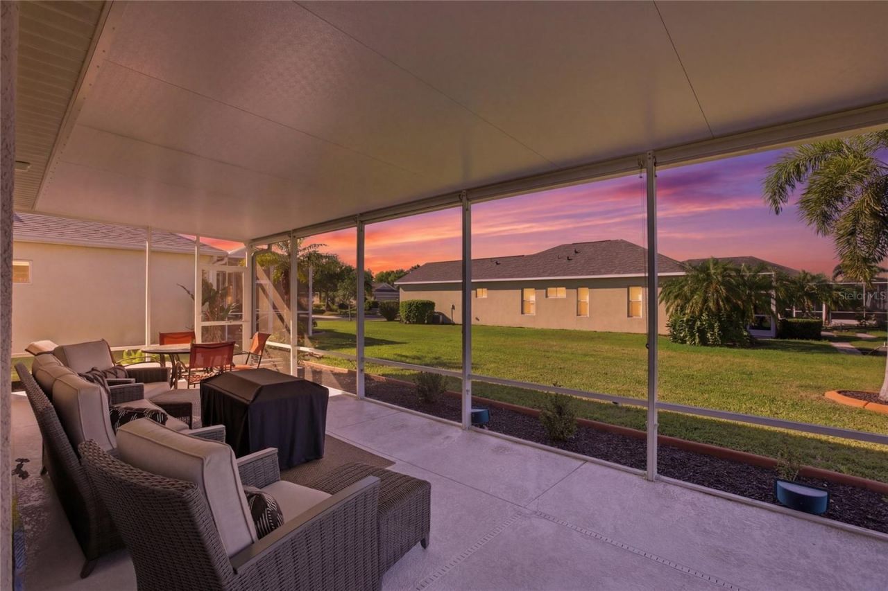 Meticulously maintained home in the gated River Sound community featuring numerous recent updates, including a new roof, new kitchen appliances, new HVAC, new water heater, new washer and dryer, fresh interior paint, and upgraded landscaping. The inviting living room showcases a tray ceiling with a ceiling fan and ceramic tile flooring. The kitchen offers a convenient breakfast bar with Corian countertops and upgraded cabinetry and backsplash, along with a cozy eat-in dining area that opens to a newly expanded screened lanai. Enjoy peaceful water views from this inviting outdoor space, perfect for relaxing or entertaining. A retractable front door screen allows for a refreshing cross breeze, bringing in natural light and fresh air. The home features a spacious primary suite with serene water views, complete with an ensuite bathroom. A second bedroom is thoughtfully positioned near a full bathroom, providing comfort and privacy for guests. Plantation shutters are installed throughout, adding both style and functionality. Residents of River Sound enjoy a variety of community amenities, including a pool and spa, playground, dog parks, scenic nature trails, and a fishing pier-offering something for everyone to enjoy the Florida lifestyle.
